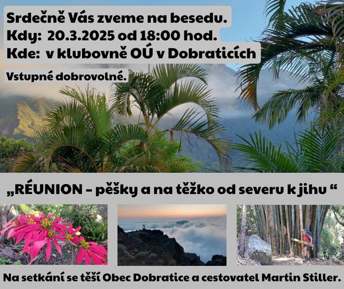 Úvod > O obci > Aktuality > Beseda "Réunion - pěšky a na těžko od severu k jihu" 20. března 2025