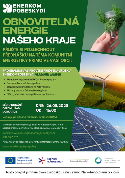 Úvod > O obci > Aktuality > ENERKOM POBESKYDÍ- beseda obnovitelná energie našeho kraje 26.5.2025, klubnovna OÚ