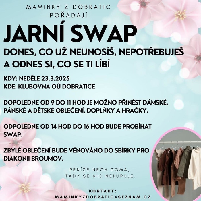 Přijďte na náš swap oblečení, doplňků a hraček! Přineste věci, které již nevyužijete, a odnesete si to, co vás zaujme. Co nenajde nového majitele, darujeme Diakonii Broumov. Akce je zdarma a představuje udržitelný a přátelský způsob, jak dát věcem druhou šanci!