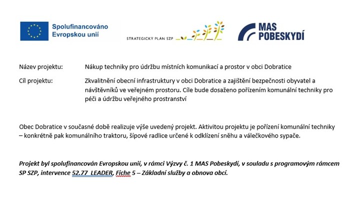 Úvod > O obci > Aktuality > Nákup techniky pro údržbu místních komunikací a prostor v obci Dobratice
