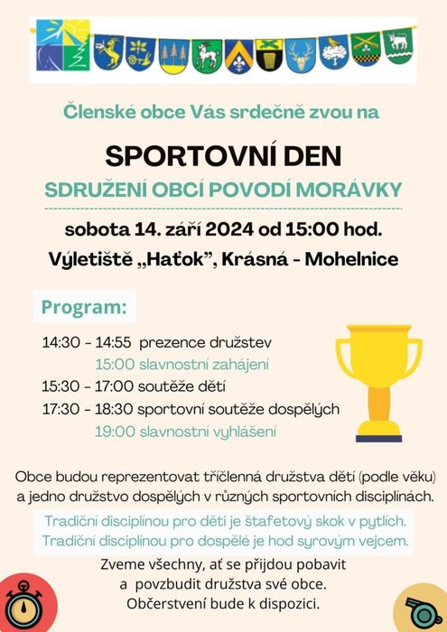Členské obce Vás srdečně zvou na Sportovní den Sdružení obcí povodí Morávky sobota 14. září 2024 od 15:00 hod.