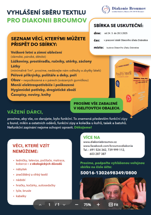 Vyhlášení sbírky textilu pro Diakonii Broumov