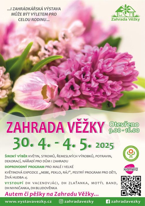 Zveřejňujeme pozvání na jarní zahrádkářskou výstavu Zahrada Věžky, která se koná od středy 30. 4. 2025 do neděle 4. 5. 2025, každý den od 9 do 16 hodin. Nakoupit si můžete květiny, stromky, potřeby pro dům i zahradu, řemeslné výrobky a něco dobrého na zub se také najde. Hudební vystoupení oblíbených kapel každý den, zábavný program pro děti, květinová expozice a mnoho dalšího! Více informací na www.vystavavezky.cz .