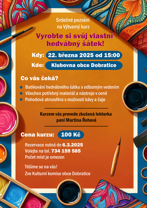 Úvod > O obci > Aktuality > Výtvarný kurz batikování hedvábného šátku 22.3.2025