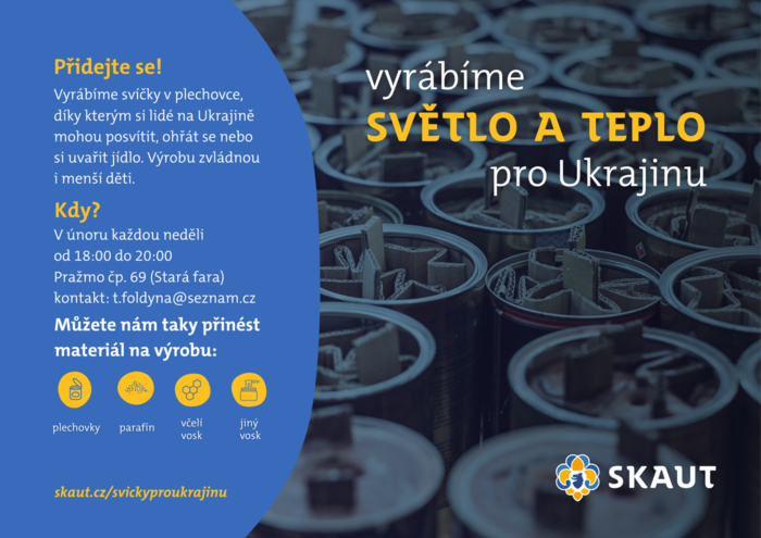 Naše oddíly pomáhají již od začátku ruské invaze na Ukrajinu v únoru 2022. Nyní vás prosíme o pomoc při vyrábění zákopových svíček pro tamější civilisty a vojáky. A proč tyto svíčky vůbec vyrábíme? Ruské útoky ničí celá města, někde nejde elektřina, nefunguje topení. A vojáci také potřebují mít možnost v nouzi se osušit, ohřát. A také jim všem dáváme najevo, že jsme na ně nezapomněli, že na ně myslíme, že nám není jedno jejich osud, vždyť naše vlast také zažila ruskou okupaci.