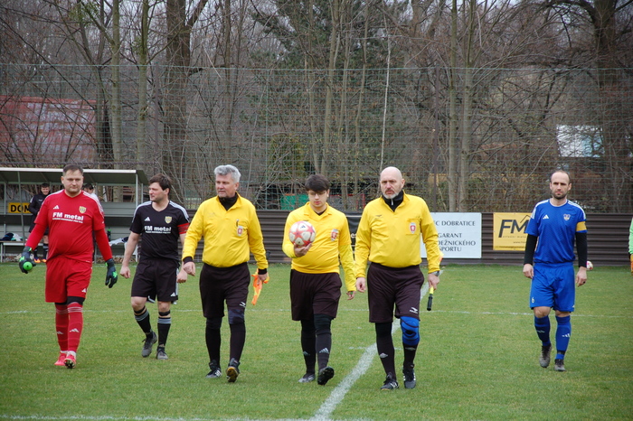 Po krátkém zpestření před fotbalovým výkopem do jarní části se již šlo na věc. Trojice rozhodčích Španihel, Seidler, Kyselý a pod dohledem delegáta FAČRu Urbance byli zvědavi i přítomní diváci, co přinese první jarní duel.