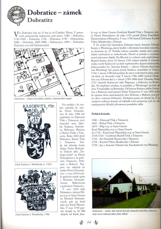 Ves vznikla v 16. století, náležela ke statku Horní Domaslavice. K roku 1580 byl majitelem vsi Zikmund Tluk z Tošanovic, jenž zanechal syny Jakuba, Kašpara, Stanislava, Baltazara, Buriana a Václava Tluky z Tošanovic. Roku 1602 držel Dobratice Bohuš Tluk Tošanovic. Tehdy dal těšínský kníže Adam Václav Bohuslavu Tlukovi dílčí „Tellengs-zettel" na Homí Domaslavice a na polo- vinu Tošanovic, Dobratic a Bukovic. Nejprve ves náležela ke statku Horní Domaslavice - v roce 1619 tvořila společný statek spolu s Horními Domaslavicemi, Bukovicemi a polovinou Tošanovic. V roce 1654 byly Dobratice v držení Filipa sp. ze Saint Genois na Horních Domaslavicích, pak jej držel jeho syn Karel Maxmilián. V roce 1718 panství koupil za 16 000 zlatých od Karla Josefa sv. p. ze Saint Genois Gottfried Rudolf Tlak z Tošanovic, který Horní Domaslavice již roku 1724 prodal Jiřímu Františkovi Harasovskému Harasova. V roce 1758 vlastnil Dobratice Kryštof Vilém Marklovský z Žebrače. V 18. století byl vlastníkem Dobratic baron Antonín Valentin KaŠnic z Weinberga, který bydlel v dřevěném loveckém zámečku, na dnešním čp. 27. Podoba tohoto menšího zámku není známa, žádné vyobrazení se nedochovalo. Patrně se jednalo o rozsahem menší přízemní objekt. Na Moravě se z tohoto rodu uvádí Johann Baptist Kašnic, který 10. března 1701 získává inkolát. V rodovém znaku nosili Kašnicové na štítě vzpřímeného doprava kráčejícího, jednoocasého lva. Antonin Kašnic - Anton Valentin Kaschnitz von Weinberg" byl synem Josefa Kašnice, zemřelého ve Vídni r. 1744.1. února 1786 byl povýšen do stavu svobodných pánů, zastával úřad c.k. dvorního rady. V letech 1786-1800 vlastnil Zdislavice (na Zdounecku) a v letech 1789-1806 držel Zdounky. Roku 1727 vlastnili Kašnicové také Šlapanice a Jiříkovice na Brněnsku. Na doplnění uveďme, že predikát z Weinberga" pochází od obce Vinohrádky na Brněnsku. Od barona Kašnice přešly Dobratice a Bukovice pod panství Dolní Tošanovice. V roce 1850 došlo ke spojení dvou samostatných obci Dobratic a Bukovic pod jed nu obec s názvem Dobratice. Dodejme pouze, že dnešní čp. 27 je moderní rodinný domek od základů nově postavený a již nic zde nepřipomíná dřívější přítomnost panského sídla.